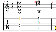 然后我们分析根音,6弦5品的“4”音,然后就是3音;5弦2品的“6”音和5弦空弦的“5”音,那么Part A最开始的根音走向,为4—3—6—5—4—3—6—6,然后按照这种根音走向重复一遍。