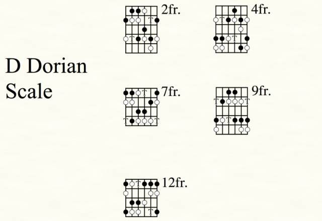 首先,这样你可以明确和弦的性质,真正知道1357在什么位置,D Dorian的和弦(Dm7)琶音是1、3b、5、7b, 之后在开始即兴演奏的时候,你就能知道哪些是和弦最重要的音,怎样去弹,在哪里弹。第二,转调很方便,比如以后要弹到G dorian或C dorian,同样是这五 个把位,指法和级数都是一样的,只是位置不同而已。