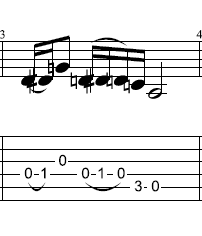 在这个大调的手型里,会出现这个大调的b3,现在咱们还没有大范围的讲调式音阶的事情,弹布鲁斯最好的理解就是在调式音阶里面将3换成b3。调式音阶1 2 3 4 5 6 b7 1(混合利地亚音阶)变成1 2 b3 4 5 6 b7 1。这就是很多人说用多利亚音阶来弹布鲁斯,就说的是这个意思。