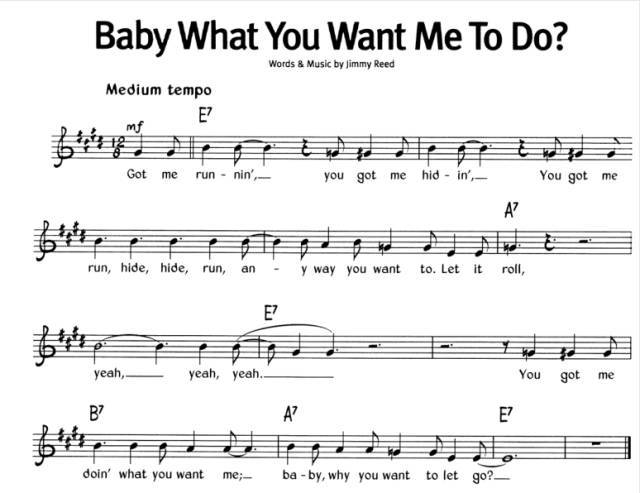 下面我们通过一个曲子来了解一下12小节布鲁斯,一首经典的布鲁斯歌曲,用的是shuffle的节奏,和声进行是标准的布鲁斯12小节,虽然不是C调的,但是和弦级数都是一样的。