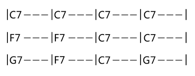 分析一下和弦,12个小节只用到了三个和弦, C7、F7、G7,分别是一级、四级、和五级,最常见的传统布鲁斯只用一四五级这三个和弦。我们用级数的概念来思考,不仅转调很方便,而且可以知道很清楚每个和弦的功能,一级是主功能,四级是下属功能,五级是属功能,传统的12小节布鲁斯就是这样一个体系。