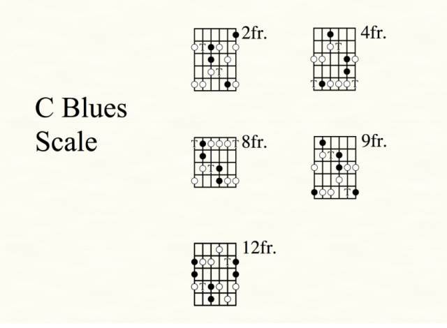我们用的一条音阶就是C小调布鲁斯音阶,和其他我们之前学习的音阶不太一样,只有6个音, 1 b3 4 #4 5 b7,有的人也把它叫做小调布鲁斯音阶。无论什么调,都要用级数的概念去演奏。在即兴演奏时,不可能一直在一个把位演奏,也不能只在一个八度里演奏。所以练习时,我们要在所有把位都练。