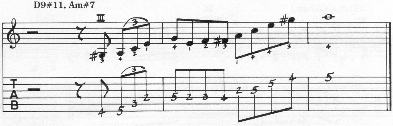 D9#11、AmM7包含很多共同音,是一对兄弟和弦,在这两个和弦上,可以使用一条A的旋律小调的乐句。